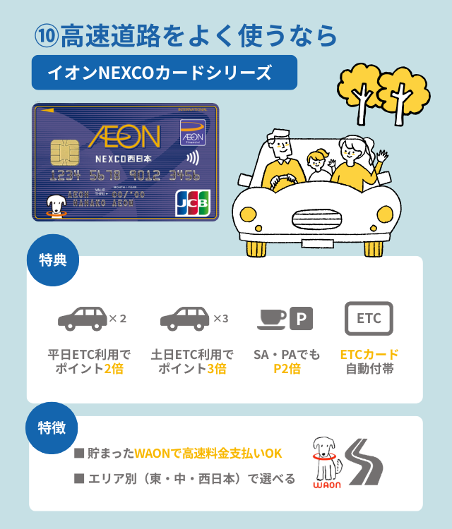 | イオン NEXCO西日本カード (WAON一体型) | ETC利用で月~金曜日はポイント2倍、土日はポイント3倍 NEXCO西日本エリアのサービスエリア・パーキングエリアでポイント2倍 |