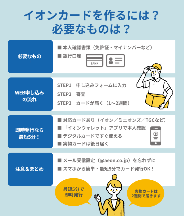 もし買い物の途中でクレジットカードが必要になっても、イオンカードなら最短5分で発行できる。