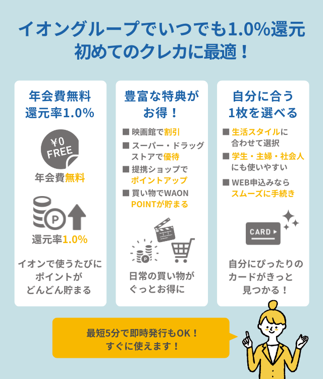 イオンカードは、基本の還元率が高く年会費無料という点で、クレジットカードデビューに最適だ。