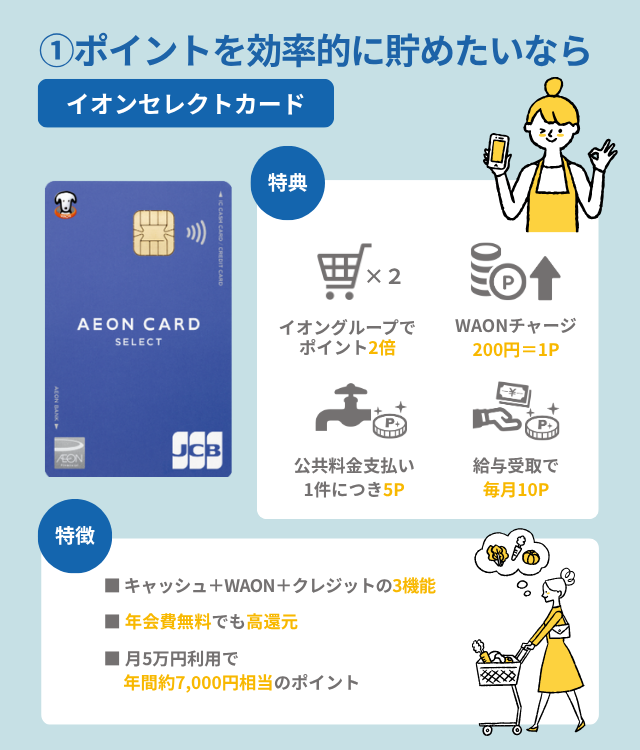 普段の買い物や支払いで自然にポイントを貯めて、いつもの日常をお得にしたい人には、イオンカードセレクトがおすすめだ。