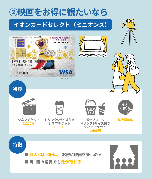 | イオンカードセレクト (ミニオンズ) | キャッシュカード/WAON/クレジットカードの3機能が一体に 映画鑑賞が年間最大30,120円お得になるカード |
