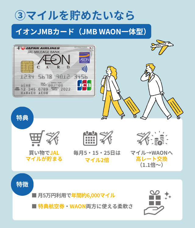 | イオンJMBカード (JMB WAON一体型) | WAONポイントの代わりに「JALマイル」が貯まるカード 最高1.25倍のお得なレートでWAONポイントに交換可能 |