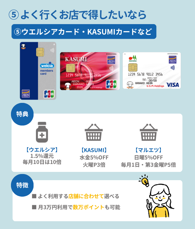 さらに、ウエルシアカードやKASUMIカードといった特定店舗に特化したカードや、映画館で優待が受けられるイオンカードセレクト(ミニオンズ)なども存在する。