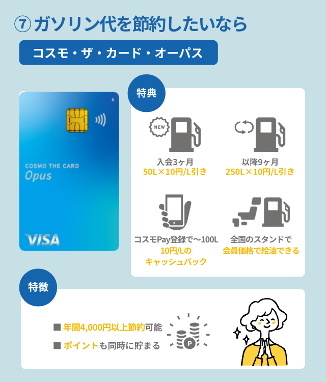 | コスモ・ザ・ カード・オーパス | 新規入会時、最大4,000円分のガソリンがキャッシュバック |
