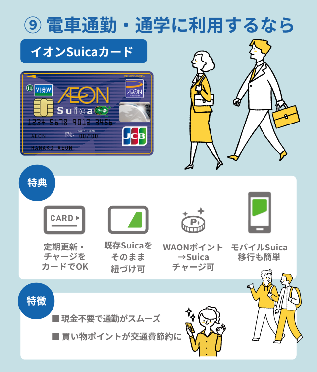 | イオンSuicaカード | クレジットカードとSuicaが一体化したカード 新規のSuica登録はもちろん、既存のSuica連携にも対応 |