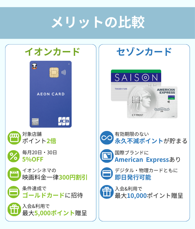 ここからは、イオンカードとセゾンカードのメリットを比較して解説する。