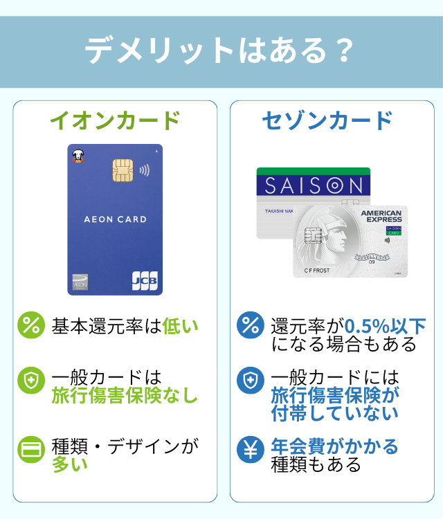 イオンカードとセゾンカードの、それぞれのメリット・デメリットや違いをまとめると以下のようになる。