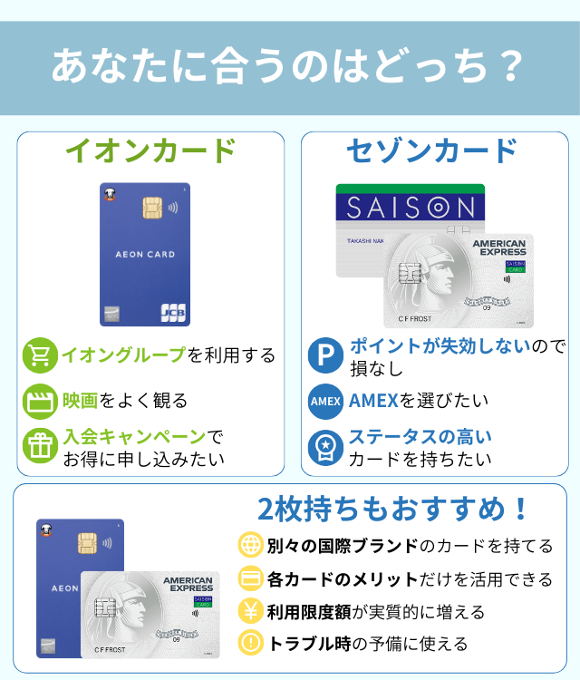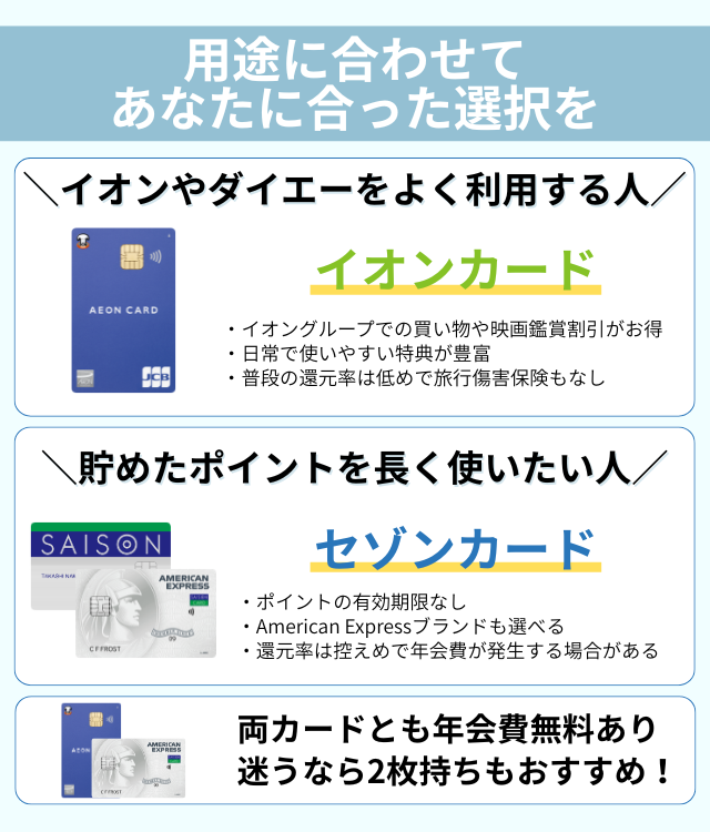 それぞれのメリット・デメリットをまとめると、イオンカードはイオンやダイエーを利用する人、セゾンカードはポイントの失効を避けたい人に向いている。