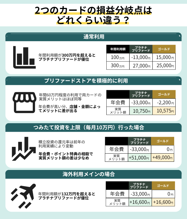 さらにワンランク下の「ゴールドカード」との損益分岐点比較や、プラチナプリファードの利用が向いている人の特徴も紹介。