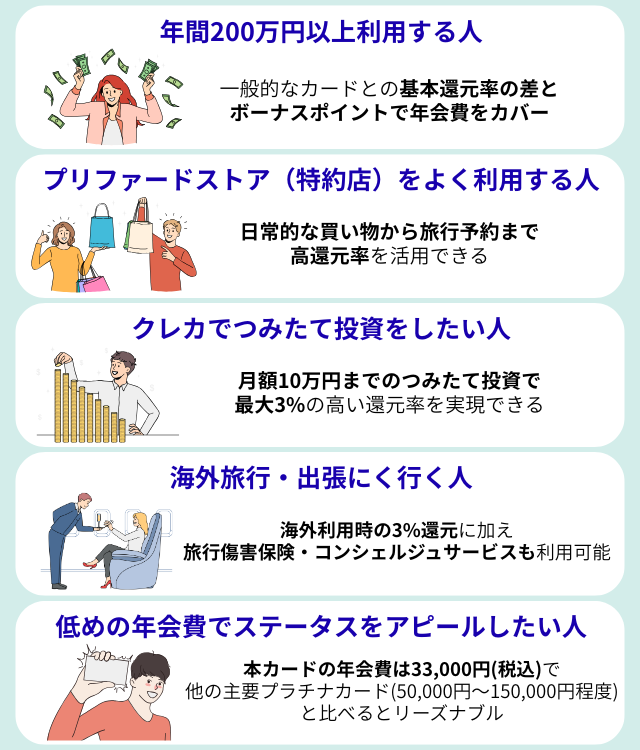 これまでの内容を踏まえ、具体的にどのような人にプラチナプリファードが向いているのか見ていこう。