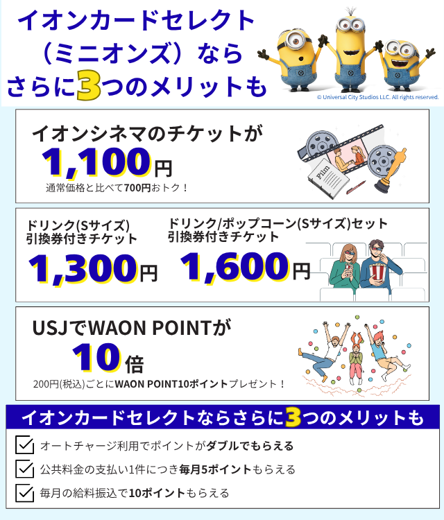 イオンシネマの鑑賞料金が安くなったり、ユニバーサル・スタジオ・ジャパンでの利用に対してポイント還元率が上がったりなど、ミニオンズ・デザインならではの特典も魅力的だ。