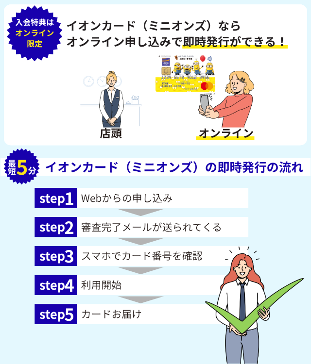 入会特典のWAON POINTの進呈を含め、特典を最大限に活用するためには、必ずWebからカードの申し込みをしよう。イオンカード(ミニオンズ)なら最短5分でカードを利用できる即時発行も可能だ。