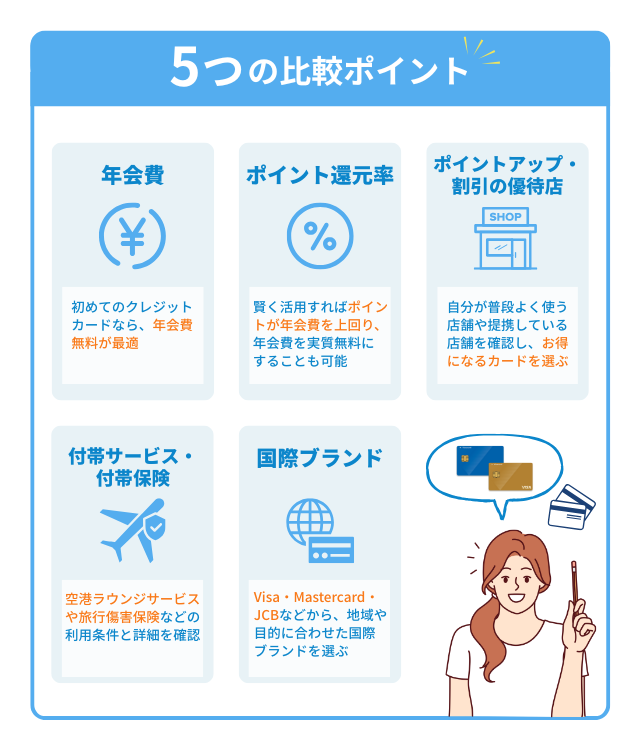 「年会費」「ポイント還元率」に加えて「付帯特典・優待」も踏まえて比較検討をすると、自身に合うカードを見つけやすくなるだろう。